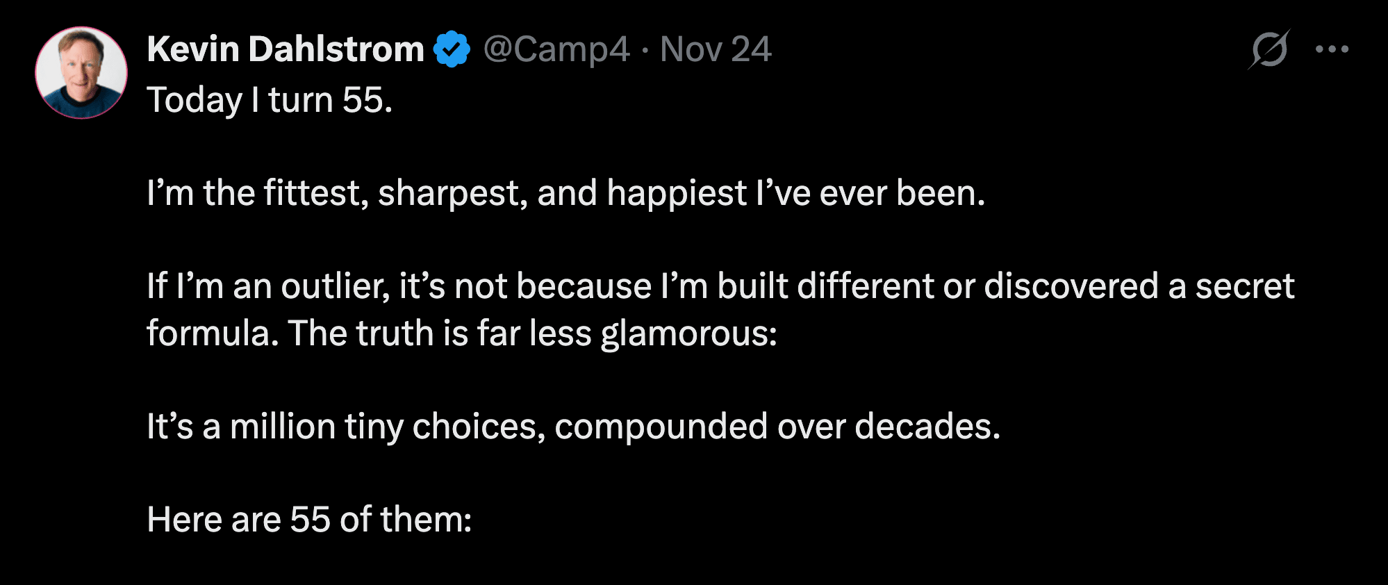 Try it out for free right now. A Twitter thread I'll be revisiting again and againThis Twitter thread went mega viral for good reason. I've seen dozens of these 'life lesson' lists, but this might be the most comprehensive one I've ever come across. Here are a few of my favorite bullets: 4. If you have a positive thought about someone, don’t keep it to yourself—share it immediately. Encouragement defies the laws of physics: When you give energy, you also receive it. 18. Spend lots of time in nature and touch the earth. Humans evolved over 300k years to live in harmony with nature, and only recently have we retreated indoors. If you don’t spend time outside, you’re fighting biology (hint: You won’t win.) 31. Invest in experiences, not things. People frequently regret buying things, but rarely regret investing in great experiences (especially when shared with loved ones). Remember, there’s nothing you can buy in a mall that you’ll remember in ten years. 38. Think globally, but act locally. Too many people put their energy into far-away problems they don’t understand and can’t impact, while ignoring problems right under their nose. Want to change the world? Start at home. 44. The goal is not to retire and do nothing, it’s to build a great day-to-day life that you don’t need to escape. A life of leisure is a slow death. Happiness isn’t possible without a little struggle, uncertainty, and skin in the game. 😂Have a great week! P.S. Reply telling me what resonated most this week! (I read and respond to them all)