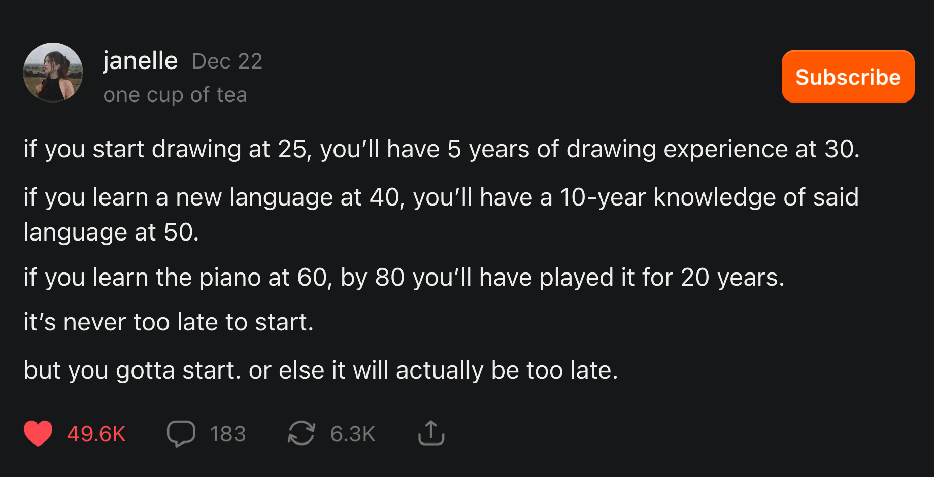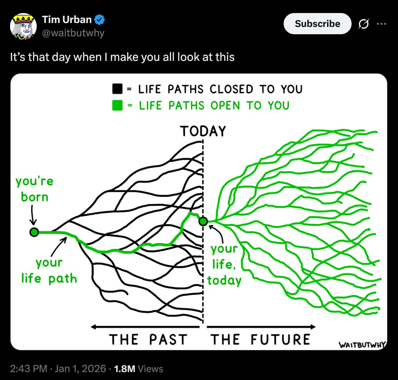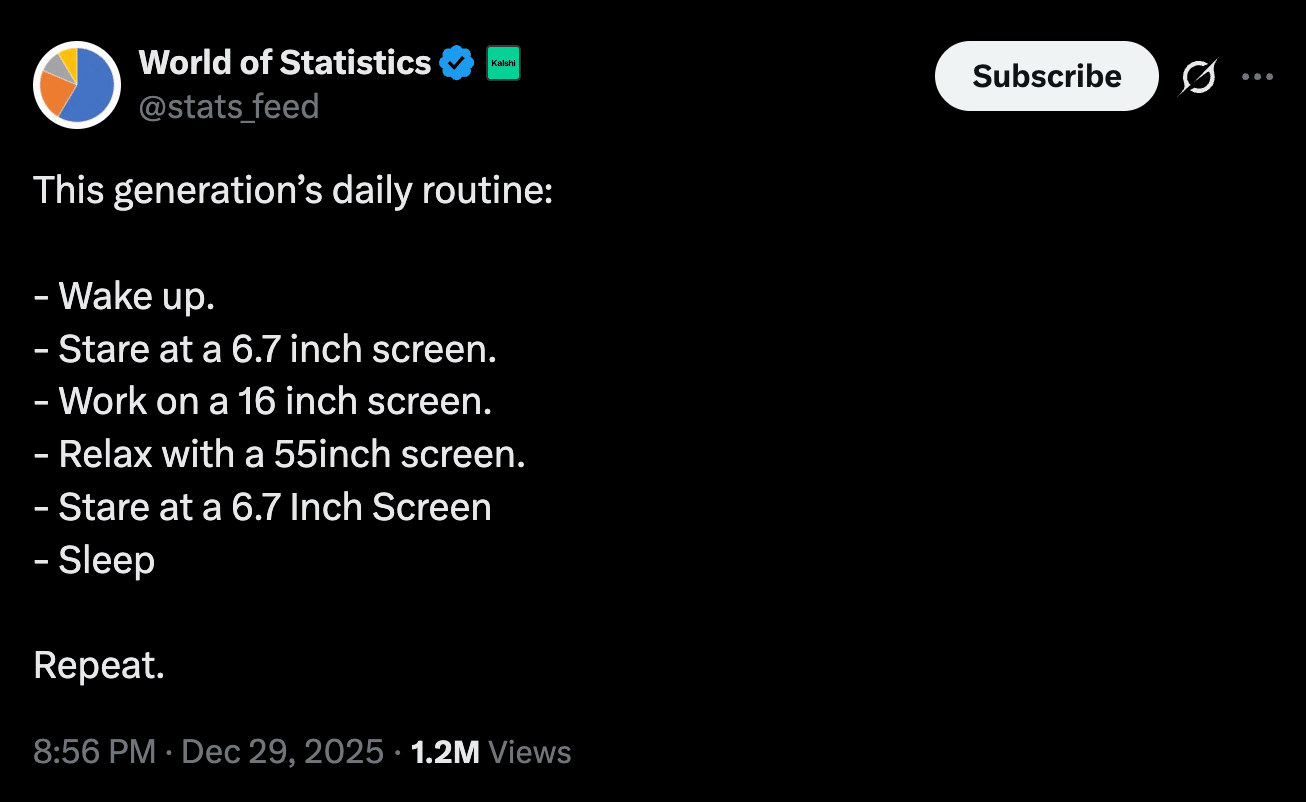 Speaking of reading more in 2026. I know not everyone has time to read 50 books this year. That's where Shortform comes in. They take books like Atomic Habits, Thinking Fast and Slow, and The Mom Test and break them down into clear, actionable summaries you can finish in 15 minutes. My challenge to you in 2026: replace one 15-minute doomscrolling session per day with a book summary. Same time investment. Completely different outcome. Use my link to try Shortform FREE + get $50 off a membership A tweet that scared the hell out of meI don't know about you, but this scares the shit out of me. A few months ago I wrote an article on Substack about how I managed to break my phone addiction after years of failing. If you're looking for actionable steps to actually reduce your screen time this year, it's worth a read. A $30 productivity tool that might change your lifeI had 3 separate people tell me this one investment changed their lives in 2025. Hint: it wasn't a course, supplement, or app. It was a whiteboard. Yep, they all told me that tracking their goals on a whiteboard was way more effective than any other app or system they'd tried. Well, it got me curious enough to grab one for my own 2026 goals. I’m not saying you need a whiteboard too. But I am saying this: track your goals somewhere visible. Not buried in a Notes app, not in a journal you open once a month, but visible. Daily. An image I share every yearTim Urban shares this every year, and I'm making it a tradition that I do too. I don't know about you, but I'm really focused on those green lines this year. Let's make this our best one yet.