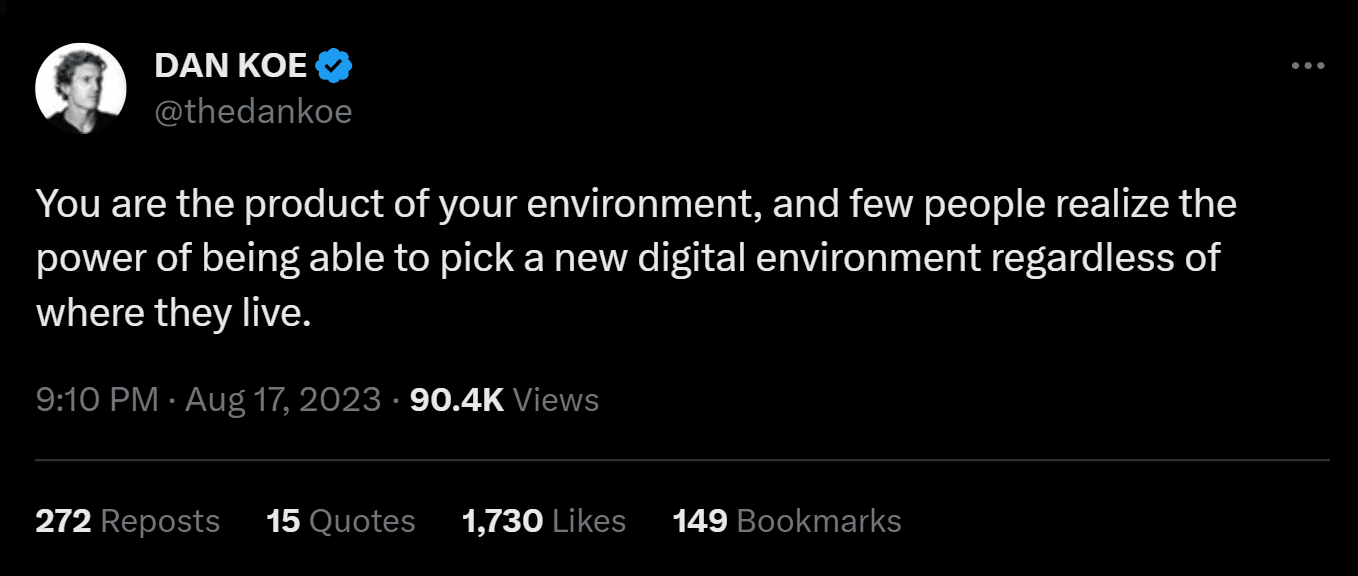 Hello friend—Colby here. I spent my weekend reading Alex Hormozi's new book and planning my upcoming trip to Japan. If you have any Tokyo/Kyoto recommendations—let me know! Estimated read time: 3 minutes and 30 seconds Before we begin... a big thank you to this week's sponsor: 1. 📱 The importance of curating your digital environment - Tweet from Dan KoeThis is one of those tweets that jolts you awake. We spend the MAJORITY of our time online. It should be pushing us towards our goal, not distracting us from it. To make this more actionable... I put together a step-by-step checklist you can follow to do a full digital environment overhaul: 2. 📝 Ten-Year-Plan for a Remarkable Life - Debbie Millman on The Tim Ferriss ShowIt's funny how things work sometimes. I was at the gym after working on the Digital Environment Design document. I wanted to listen to a podcast, so I searched for the best Tim Ferriss Show episodes. This one came up—with legendary designer Debbie Millman. And wouldn't you know it, they started talking about an exercise to design the life you want. I thought, "This pairs perfectly with the digital environment design". It's called “Your Ten-Year Plan for a Remarkable Life”: Write down what your life could be in 10 years, if you could do anything you wanted, without fear of failure. Here are the instructions from Debbie herself: So let's say it's Winter 2033.