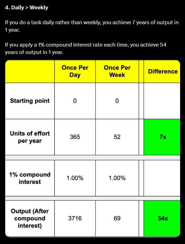 If you wait until you're not busy to start, as soon as you get busy again you'll stop. My challenge to you: 4. 📈 The Power of Compound Interest - Idea from George MackThings that compound (other than money):